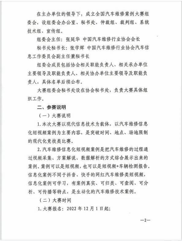 为促进汽车维修行业维修案例数据的有序发展,积极响应国家有关弘扬工匠精神、强化人才培养的号召,在疫情防控常态化情况下,以高效、低成本线上竞赛的组织形式,由中国汽车维修行业协会主办2022年首届全国汽车维修案例大赛即将于2022年12月1日正式开赛,进一步促进汽车维修相关政策、规范的落实,体现维修企业一线的实际情况,提升汽车维修从业人员技能水平,提升行业服务质量。