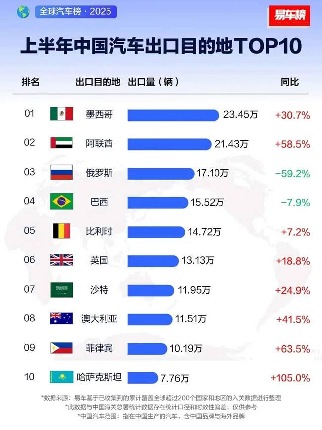 近日,易车基于已收集到的累计覆盖全球超过200个国家和地区的入关数据整理显示:6月中国汽车出口目的地前3名分别为阿联酋、墨西哥、英国,出口量分别为:3.65万、3.46万、2.75万。上半年中国汽车出口目的地前3名分别为墨西哥、阿联酋、俄罗斯,出口量分别为:23.45万、21.43万、17.10万。此数据与中国海关总署统计数据存在统计口径和时效性偏差,仅供参考
