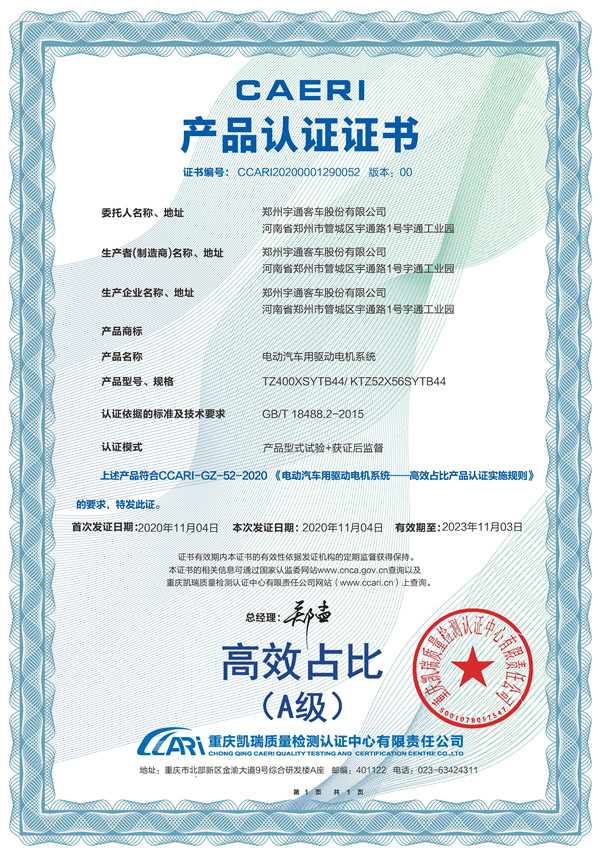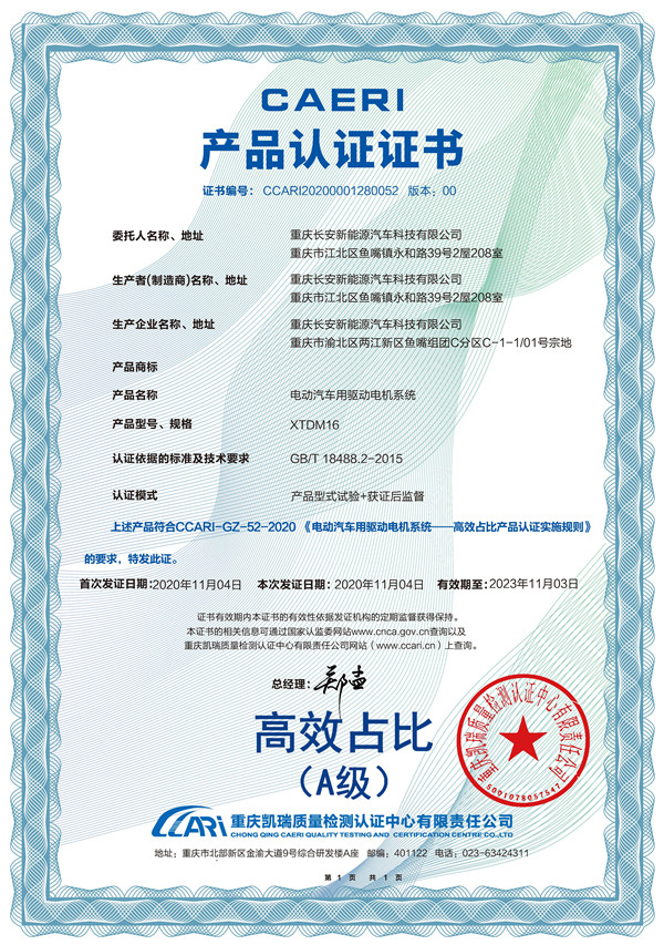 11月19日,在中国汽车工程研究院股份有限公司(以下简称“中国汽研”)检测事业部副总经理兼新能源汽车中心主任阮廷勇的见证下,重庆凯瑞质量检测认证中心有限责任公司(以下简称“凯瑞认证”)总经理郑孟分别向重庆长安新能源汽车科技有限公司和郑州宇通客车股份有限公司颁发了驱动电机系统高效占比认证证书。