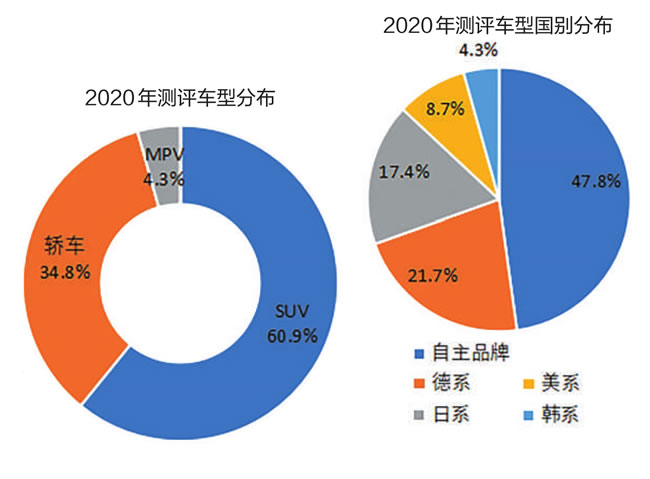 从2020年测评的具体车型看,SUV有14款、轿车有8款、MPV有1款;传统燃油车型和新能源车型分别为18款和5款,各占78%和22%。测评车型的价格区间为9万~39万元,
