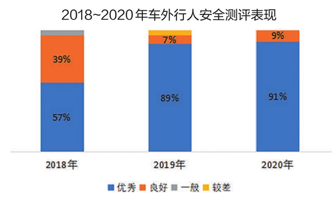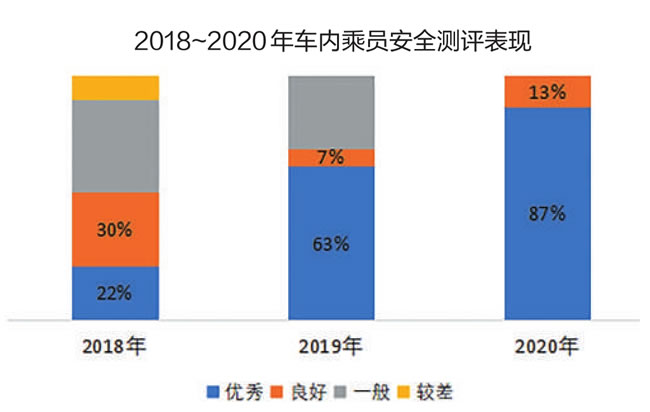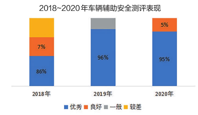 总体来看,在车内乘员安全、车外行人安全和车辆辅助安全方面,2020年参与测评的车型整体表现较好,得到优秀评分的车型分别占87%、91%和95%,呈逐年上升态势,说明车辆安全性有所提高。