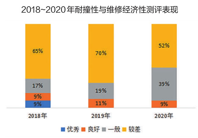 相比之下,耐撞性与维修经济性仍是不少车辆的弱项。报告显示,2020年耐撞性与维修经济性表现较差的车型占半数以上(52%),表现一般的车型占39%,表现良好的仅占9%。虽然表现较差车型占比较2019年下降了18个百分点,但表现良好车型占比也同样下降了2个百分点。而且,近两年这一方面都没有表现优秀的车型。