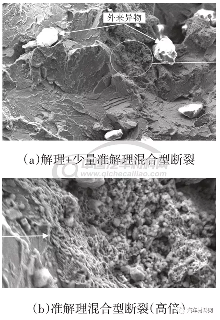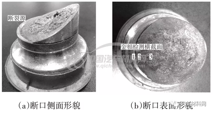 b.汽车轮毂轴断裂的原因是,在行驶过程中受到较大的额外冲击载荷之后,由于过载而产生快速脆性断裂,断裂失效与其材质及热处理质量无关。