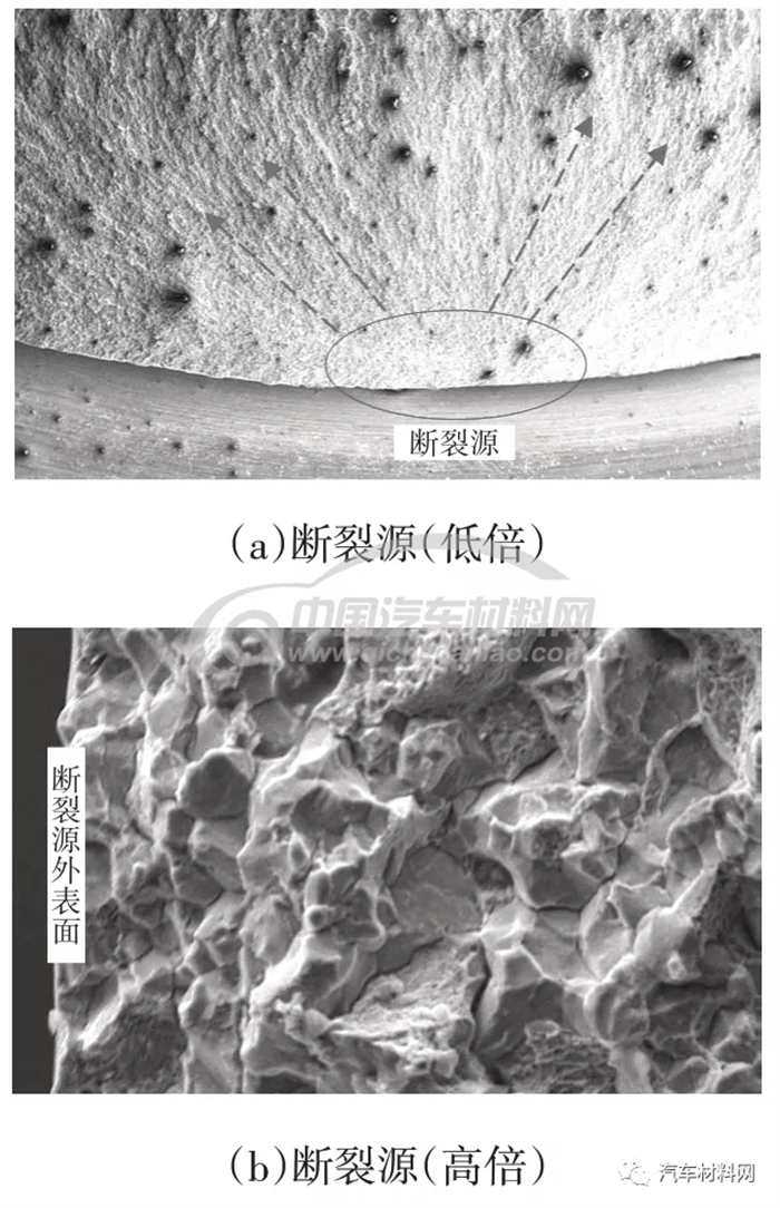 a.汽车轮毂轴断裂起源于与内圈过盈配合的边缘R区,断裂性质为一次性弯曲脆性断裂。