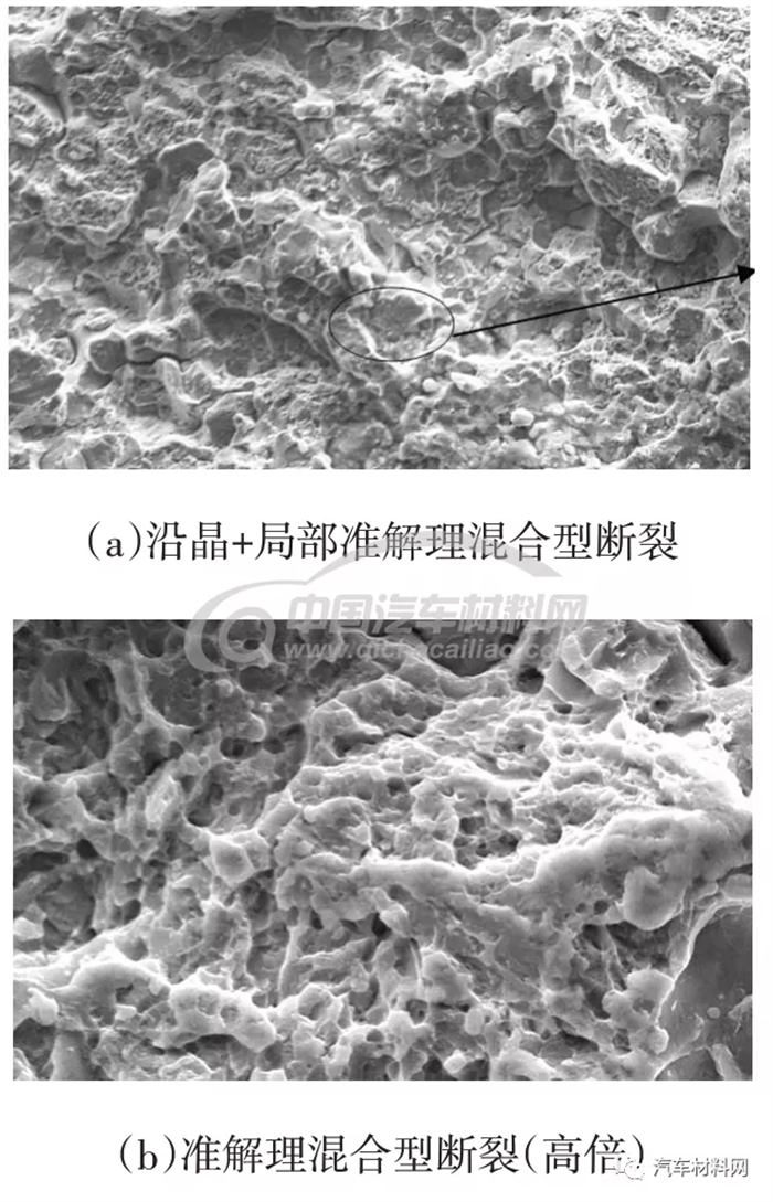 综合上述试验结果可知,该汽车轮毂轴的材质满足65Mn相关技术要求,其基体热处理质量和轴径表面感应淬火质量均满足产品图纸的技术要求,因此该轮毂轴断裂失效与其热处理质量无关。从断裂面的宏观及微观断裂特征看出,裂纹起始于轴与内圈小端面配合边缘区的外表面处(R区),裂纹源区为沿晶开裂,感应淬火层和基体区都出现了明显的解理断裂特征,整个断口面无任何疲劳特征,说明断裂属于脆性开裂。