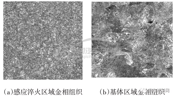 按图1b所示的虚线在裂纹源区进行取样,制样完成后,用4%硝酸酒精溶液(体积分数)腐蚀观察面,采用Axio Vert.A1型金相显微镜进行金相组织观察,结果见图5所示。看出,表层感应淬火区域的金相组织为5级回火马氏体,且组织均匀性较好,满足感应淬火工艺对金相组织的要求;心部基体组织为细片状珠光体+少量球状珠光体,亦满足等温退火工艺对产品金相组织的要求。