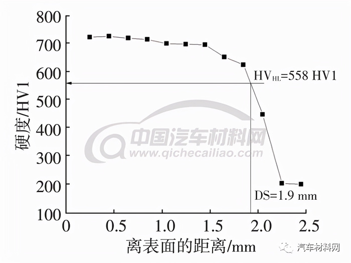 利用MH-5L型显微维氏硬度计对断口面附近R区的有效硬化层深度(DS)进行测量,结果见图6所示。从距离外表面0.25 mm处开始测试,测试载荷为1.0 kg,保载时间为10 s,以极限硬度HVHL=558 HV1来评估其DS值。得出表面硬度为726 HV1(依据GB∕T 1172—1999换算为61.3 HRC),DS=1.9 mm,可见表面硬度及DS值均满足感应淬火工艺的技术要求,但是DS偏下限。