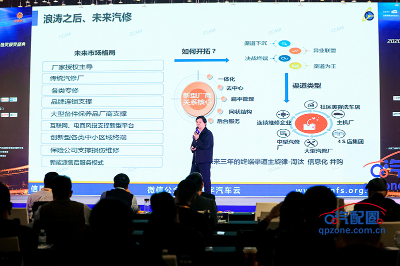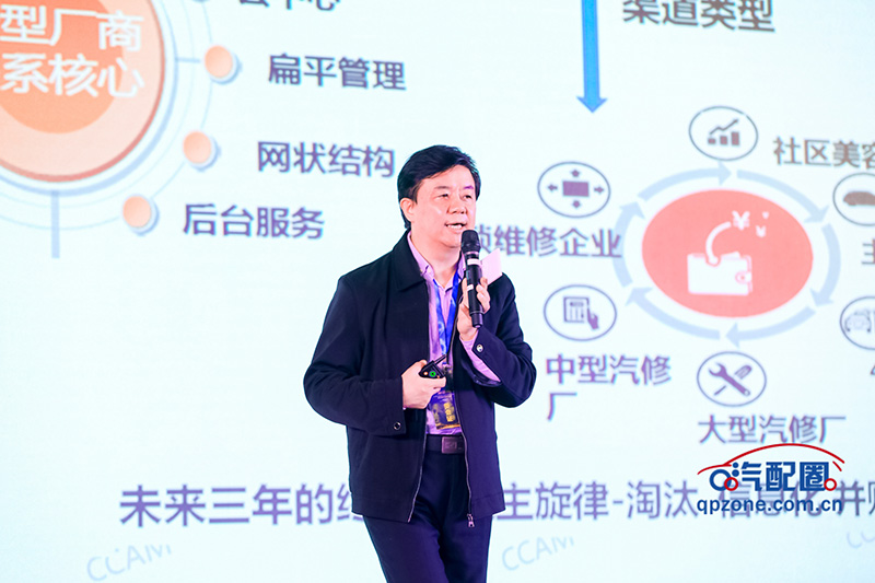 主机厂家,因为它掌握的技术、资源、资金,厂家授权主导。在某一个地区通过经销商进行不停的分级部类,4S店、中心、门店,通过这种方式,传统的汽车维修企业,空间进一步受到压缩。保险公司支撑的损伤维修和新能源的售后服务模式可能会是一个重点。昨天我们发改委财政部又是几百个亿新能源的补贴,重点是补贴售后网络。根据我们汽车维修网络的变化,各位在座的配件供应商应该实时的调整你们的政策,因为中国的维修企业才是汽车零部件的真正买单人。虽然车主有决定权,但是买单人还是在维修企业。这种这种维修终端的变化不是一成不变,会一体化、去中心、扁平化,而且这种渠道支撑我认为是不可避免的。