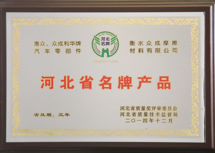 公司生产的"惠众"、"众成利华"牌刹车片,获省著名商标、省名牌产品称号。另外,河北省摩擦材料产品质量监督检验中心坐落我厂,配备了国内外先进的检测设备,有制动器惯性试验台、美国CHASE试验机、剪切试验机、电动硬度计、热膨胀压缩试验及、光谱分析仪、盐雾测试机、化工材料分析室等,为公司产品研发、检测提供了强有力支持。