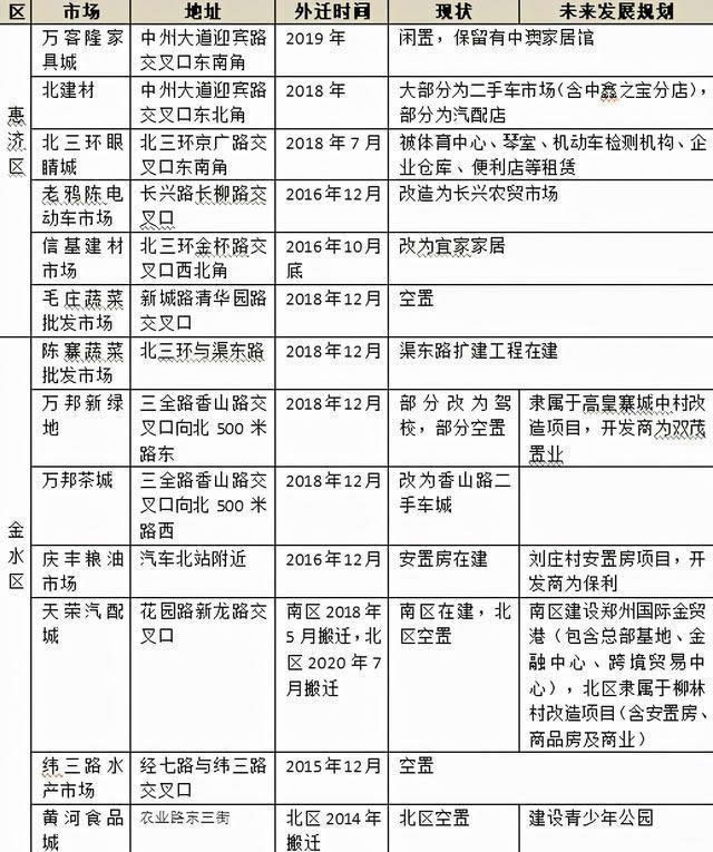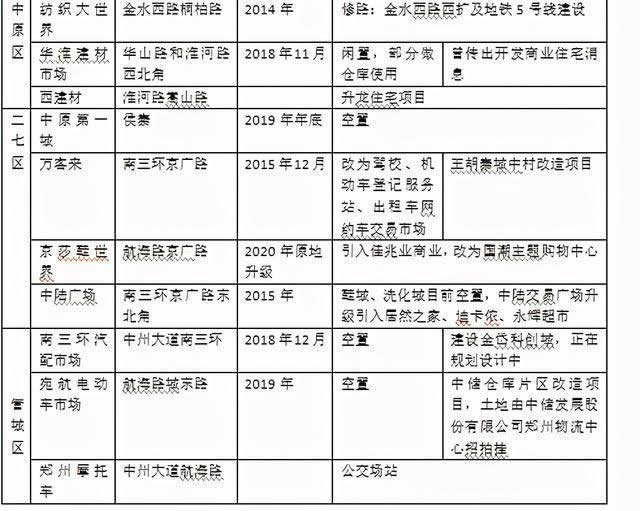当然,也有一些处于闲置的老市场,比如南三环汽配城、万客隆家具城、纬三路水产市场、华淮建材市场、中原第一城、毛庄蔬菜批发市场、天荣汽配城北区、中陆鞋城、中陆洗化城。这部分比例最大,占比43%。