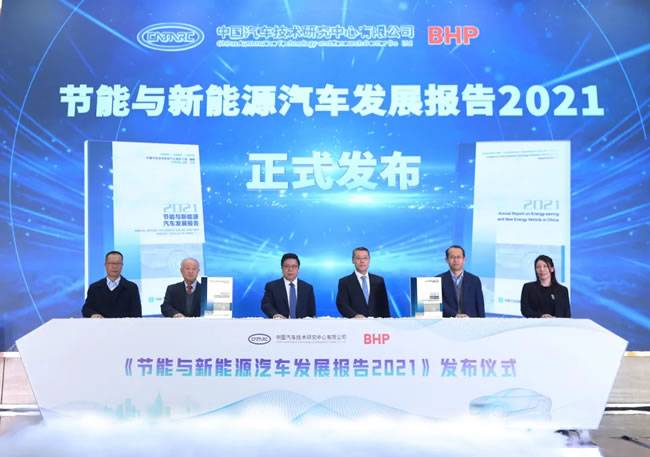 中汽中心党委委员、副总经理吴志新、必和必拓中国区总裁王跃奎、天津大学教授姚春德、中国电子科技集团公司第十八研究所研究员肖成伟、上汽通用五菱总经理助理梅胜军、北汽新能源总经理助理刘晓萌等出版单位、支持单位领导,行业和企业专家代表上台,共同发布《节能与新能源汽车发展报告2021》。