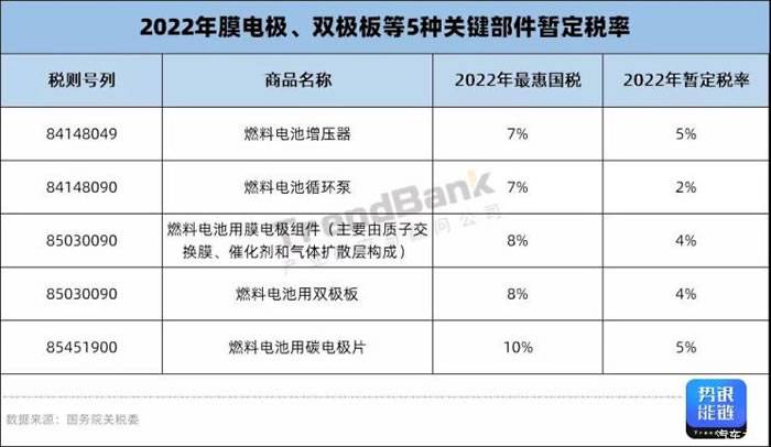 12月15日,国务院关税税则委员会发布《2022年关税调整方案》,2022年将调整部分商品的进出口关税。5种燃料电池关键零部件2022年暂定税率见下图: