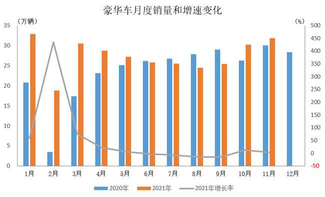 2021年11月,国内生产的豪华车销量完成31.9万辆,同比增长3.5%,增幅比10月回落9.4个百分点。1-11月,国内生产的豪华车销量完成311.2万辆,同比增长19.5%,高于乘用车累计增速12.4个百分点。