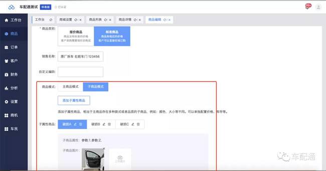 针对目前同类商品存在多种规格或者参数的情况,例如拆车件的不同破损程度;改装件的不同改装方案等等。通过子商品功能将有效解决商家针对该情况的商品交易模式