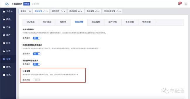 基于商品分享存在只能查看不能购买,需要由代理商下单服务的商业模式,车配通增加了分享关闭购买的功能。