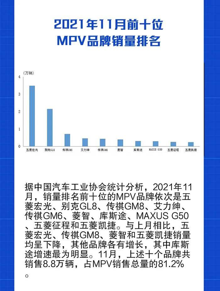 据中国汽车工业协会统计分析,2021年11月,销量排名前十位的MPV品牌依次是五菱宏光、别克GL8、传祺GM8、艾力绅、传祺GM6、菱智、库斯途、MAXUS G50、五菱征程和五菱凯捷。与上月相比,五菱宏光、传祺GM8、菱智和五菱凯捷销量均呈下降,其他品牌各有增长,其中库斯途增速最为明显。11月,上述十个品牌共销售8.8万辆,占MPV销售总量的81.2%。