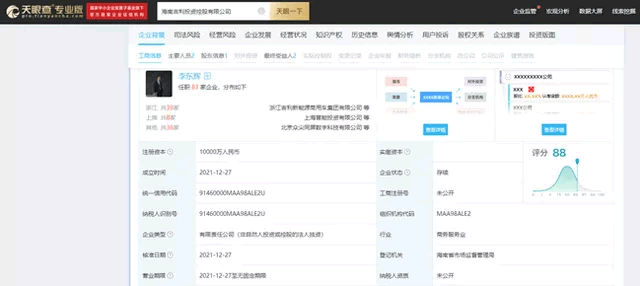 12月27日,海南吉利投资控股有限公司成立,法定代表人为李东辉,注册资本1亿元人民币,经营范围包含:以自有资金从事投资活动;汽车零部件研发;电机及其控制系统研发;能量回收系统研发;机械设备研发;汽车新车销售;新能源汽车整车销售;汽车零配件批发;汽车零配件零售等。天眼查股权穿透显示,该公司由浙江吉利控股集团有限公司100%控股。