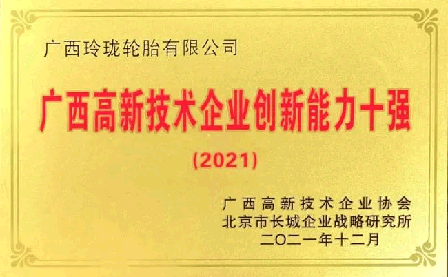 2021年12月17日,广西科技厅发布了“2021年广西高新技术企业百强”等榜单。该榜单以2018-2020年国家高新技术企业火炬统计数据为基础,以规模性与成长性、创新投入、创新产出等主要指标进行综合遴选,广西玲珑轮胎有限公司入围“2021年广西高新技术企业百强”、“2021年广西创新能力十强”榜单。