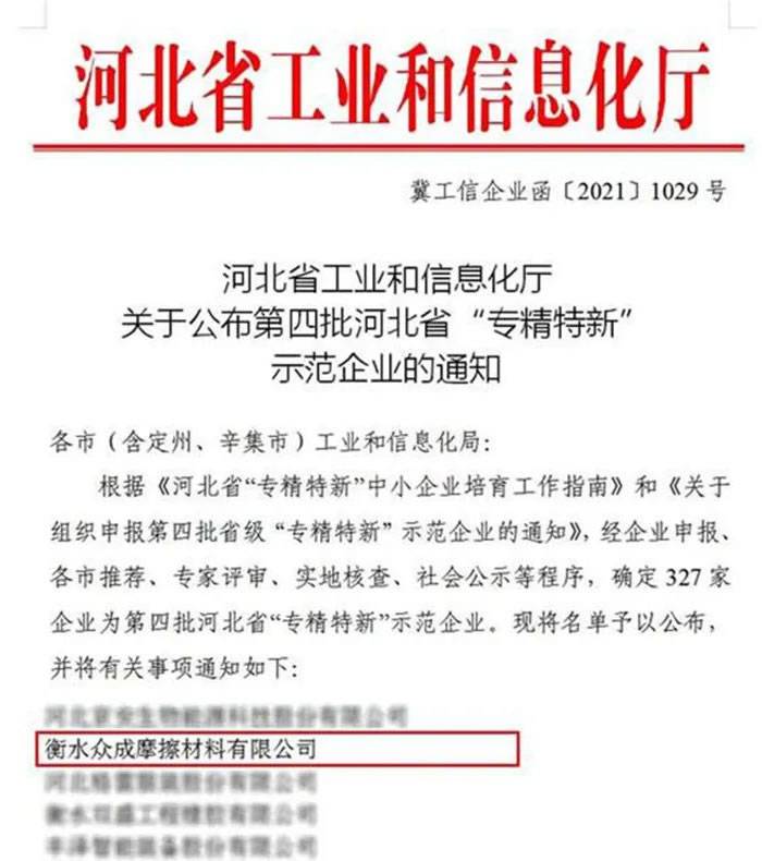 【衡水众成摩擦材料有限公司荣获省级专精特新企业荣誉】