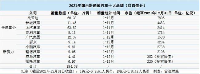新能源汽车盛宴,谁是最大赢家?雷达财经以截至去年12月31日市值、估值为依据,在传统车企和造车新势力各选取前五名,发现比亚迪、长城汽车、上汽集团、吉利汽车、广汽集团、蔚来、小鹏、理想、威马和哪吒汽车,堪称2021年国产新能源汽车十大赢家。