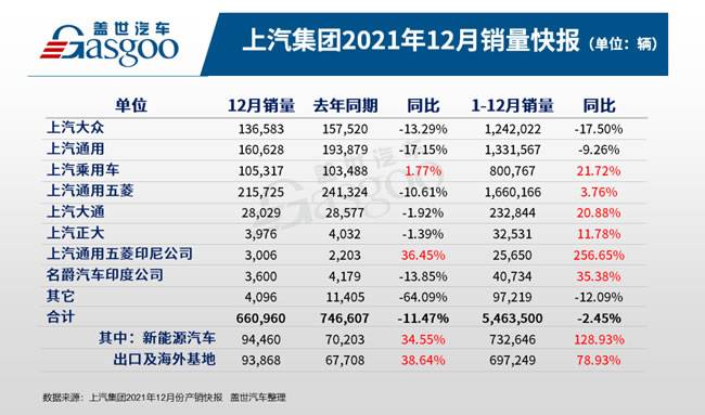 日前,上汽集团公布了2021年12月产销快报。数据显示,其12月整车销量为66.1万辆,同比下滑11.47%。随着12月销量的出炉,上汽集团2021年全年销量最终达成546万辆,同比微跌2.45%,未能实现去年年初公布的617万辆销量目标。