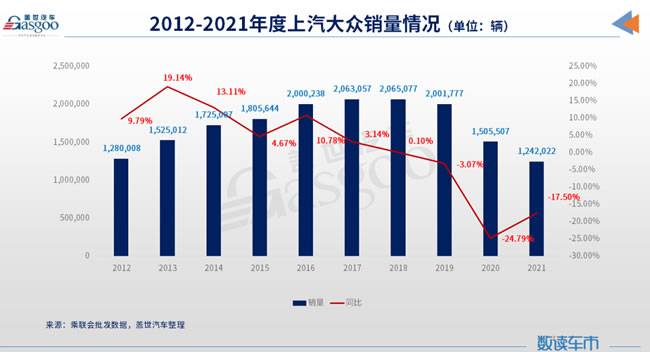 2021年上汽大众以124万辆的成绩收官,这一数据也是上汽大众近10年来的销量新低。2020年,上汽大众从年销量200万辆的神坛上走了下来,最终销量定格在150万辆,而2021年出现的同比17.5%的跌幅则预示着上汽大众想要重回200万辆年销量规模相当困难。
