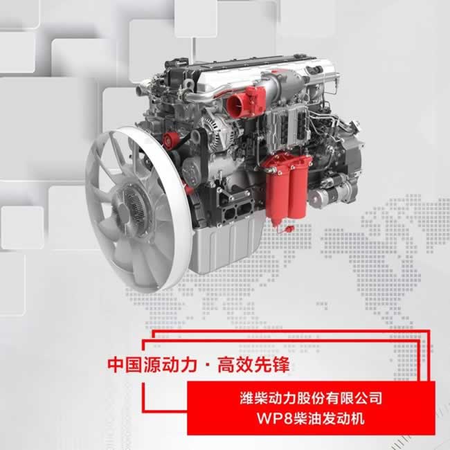 潍柴WP8发动机采用高爆压、高轨压设计理念,燃油经济性更优、更节能;通过应用高效电控放气阀增压器等部件,满足车辆对低速大扭矩的性能需求。该款产品通过严格的耐久考核试验,累计完成超过1万小时;300辆整车的道路耐久试验累计超过5000万公里;通过台架和市场长期多样本积累数据分析,关键摩擦副寿命达120万公里的B10寿命,并顺利通过了高原、高温、高寒等极限环境下的考验。