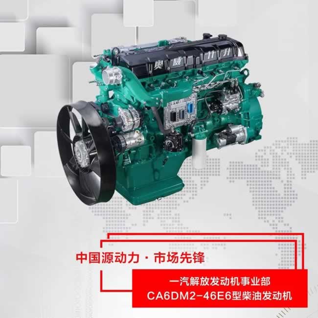 该款发动机采用一汽解放分布式低污染高效燃烧技术、自主2000bar高压电控共轨系统,专有电控非对称高效增压技术,实现最高功率338kW,最大扭矩2300N·m,升扭矩达209N·m/L,缸内最大爆发压力提升至230bar,热效率达到46.5%;采用专用凸轮发动机制动技术,制动功率大于290kW;高强度高耐热蠕铁缸盖及全球首发的激光焊接钢活塞等技术,实现高爆压、高热效率的同时,达成150万公里长寿命,实现15万公里超长保养周期。CA6DM2-46E6发动机生产一致性稳定,排放裕度>20%,相比竞品可节油3%以上,尿素消耗比低3%以上,产品性能达到国际先进水平。
