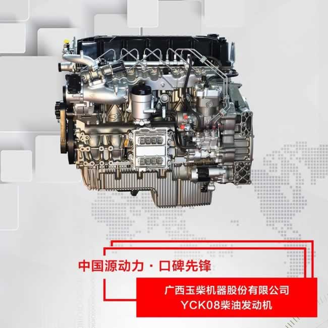 玉柴YCK08是新一代全新设计的中型柴油发动机,以满足国六b排放标准为设计起点,设计爆压200bar,并具备升级至250bar的潜力。该款产品联合AVL开发,以世界知名的奔驰OM936发动机为标杆,采用模块化、轻量化设计,具有结构紧凑、重量轻、节能、低排放、智能控制等特点,是世界最先进技术的组合和体现。玉柴YCK08排量7.698L,最大功率257kW、最大扭矩1450N·m,发动机在800rpm转速时扭矩达1000N·m以上。结合高压共轨及高效燃烧技术,该款产品最低油耗低至188g/kWh,怠速工况噪声低于74dB(A),均达到世界先进水平。