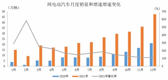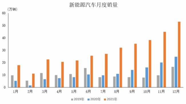 2021年12月,新能源汽车产销分别完成51.8万辆和53.1万辆,再创历史新高,同比分别增长1.2倍和1.1倍。