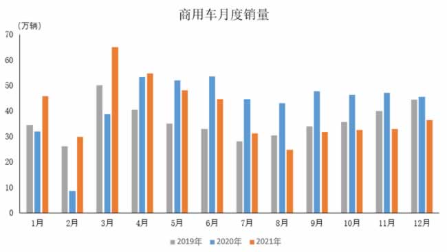 2021年12月,商用车产销38万辆和36.4万辆,环比增长7.7%和10.5%,同比下降25.3%和20.1%。在商用车主要品种中,与上月相比,货车和客车产销均呈增长,客车增速更为明显;与上年同期相比,货车和客车产销依然呈较快下降。2021年,商用车产销467.4万辆和479.3万辆,同比下降10.7%和6.6%,结束了上年快速增长趋势。在商用车主要品种中,与上年同期相比,客车产销呈较快增长,货车产销均呈下降。