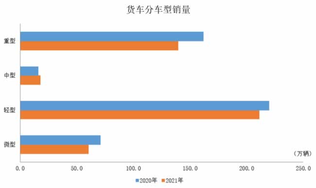 2021年12月,在货车细分品种中,与上月相比,重型货车产销呈较快增长,轻型货车产量略增,销量明显增长,中型货车产量有所下降,销量呈较快增长,微型货车产销均呈下降;与上年同期相比,四大类货车品种产销均呈下降,重型货车降幅更为明显。2021年,在货车主要品种中,与上年相比,中型货车产量有所下降,销量呈较快增长,其他三大类货车品种产销均呈下降,重型和微型货车降幅更明显。