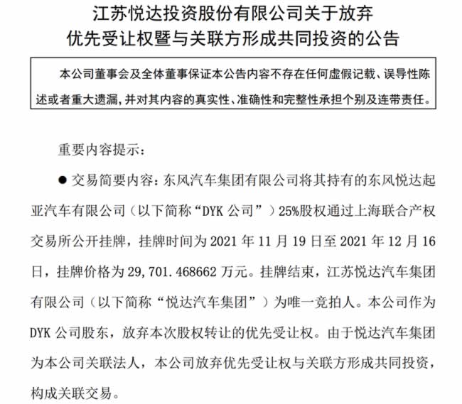 在过去的2021年,起亚在国内发生重大改变。2021年11月19日,东风汽车集团有限公司将其持有的东风悦达起亚汽车有限公司25%股权通过上海联合产权交易所公开挂牌,挂牌价格为2.97亿元。2022年1月12日,东风汽车集团有限公司将其持有的东风悦达起亚汽车有限公司25%股权已成交,江苏悦达汽车集团有限公司(以下简称“悦达汽车集团”)为唯一竞拍人。