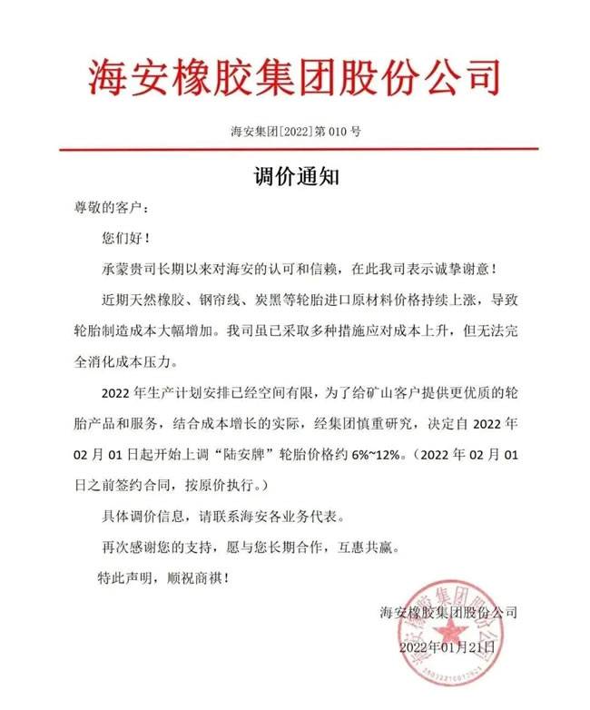 近日,海安橡胶集团发布涨价通知,涨幅一度达到12%。通知中称,近期天然橡胶、钢帘线、炭黑等轮胎进口原材料持续上涨,导致轮胎制造成本大幅增加。公司虽已采取多种措施应对成本上升,但无法完全消化成本压力。因此,公司决定自2022年02月01日起开始上调“陆安牌”轮胎价格约6%~12%。