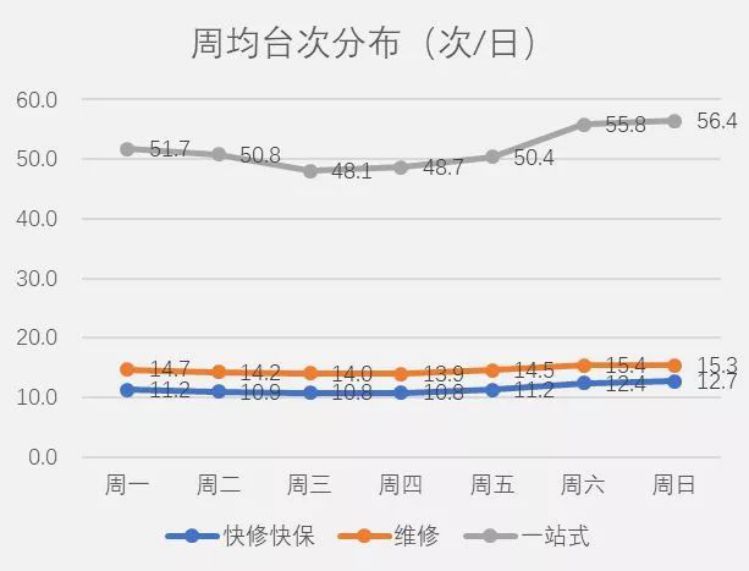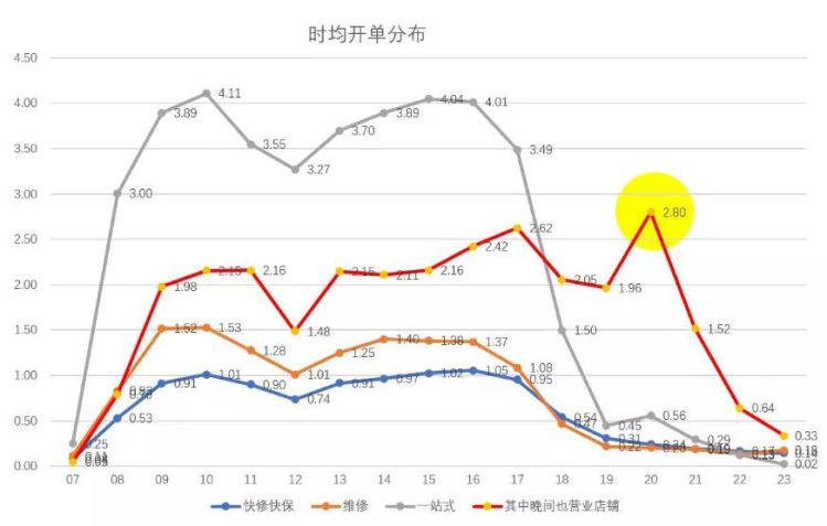 晚间营业的维修门店,晚20-21点是全天进厂台次最高的时段。门店可根据地理位置(如居民小区)、周边目标车主特征,尝试延长营业时间,方便车主,人性化服务。