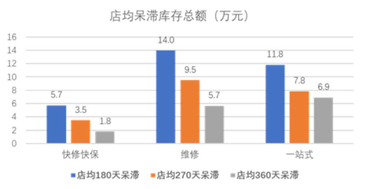 维修门店的180天呆滞库存金额是月均产值的64%,360天呆滞库存率为9%-19%,库存管理水平有待提高。