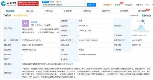 天眼查App显示,近日,奉新时代新能源材料有限公司成立,注册资本10亿人民币,法定代表人为林美娜,经营范围含碳酸锂系列产品、锂电正极材料及其他化工产品的研发、生产和销售;新材料技术研发、推广服务等。股权穿透图显示,该公司由宜春时代新能源资源有限公司(宁德时代全资子公司)、苏州天华超净科技股份有限公司共同持股,持股比例分别为90%、10%。