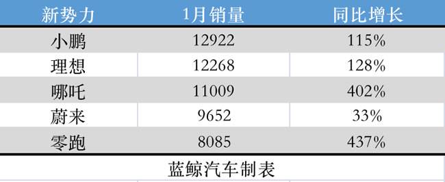 1月,蔚来汽车交付9652台,同比增长33%,在新势力中排名第四;而零跑汽车交付再创新高,同比增长434%,达到8085台,在新势力中排名第五。