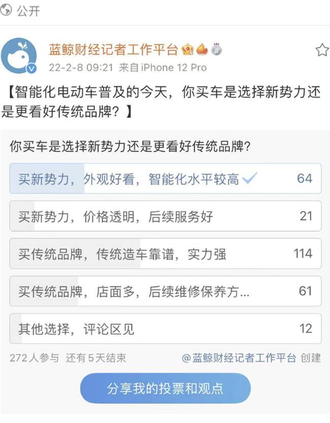 蓝鲸财经在微博上发起了买车选择新势力还是传统品牌的投票调查。根据调查结果显示,44%的消费者认为传统车企靠谱、实力较强;23%的消费者认为传统品牌店面多,后续维修保养方便。25%的消费者则认为新势力外观好看,智能化水平高;仅有8%的消费者认为买新势力的车是因价格透明,后续服务好。