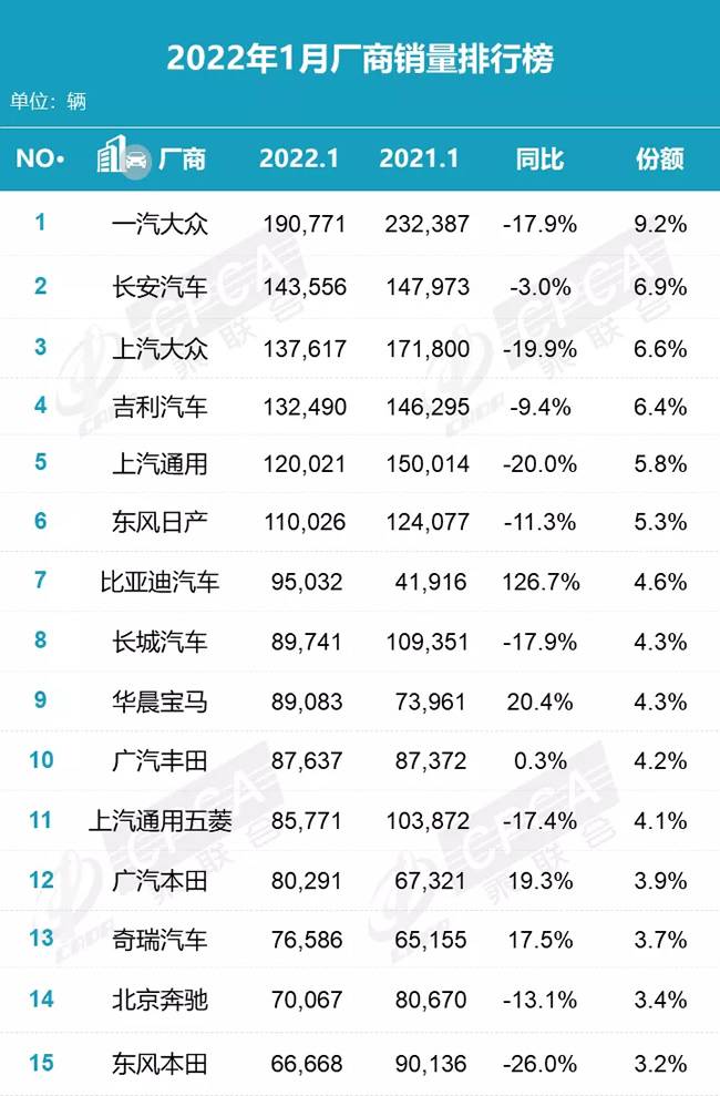 TOP15车企合计零售销量157.5万辆,市场集中度为75.8%,较2021年12月提升1个百分点。1月车系销售结构如下: