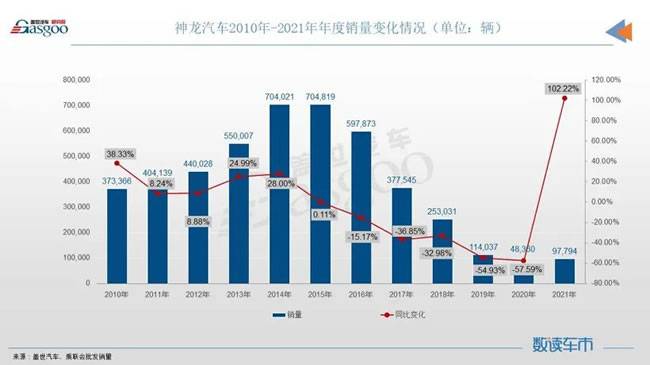 虽然被突如其来的疫情影响了整体进度,但不可否认,“元计划”和“元+计划”的发布,对神龙汽车的提振可谓是立竿见影。2021年神龙汽车把年销量拉回到了接近10万辆,虽然绝对量不高,但翻番的增长幅度还是足以证明神龙汽车正在重新回归市场赛道。