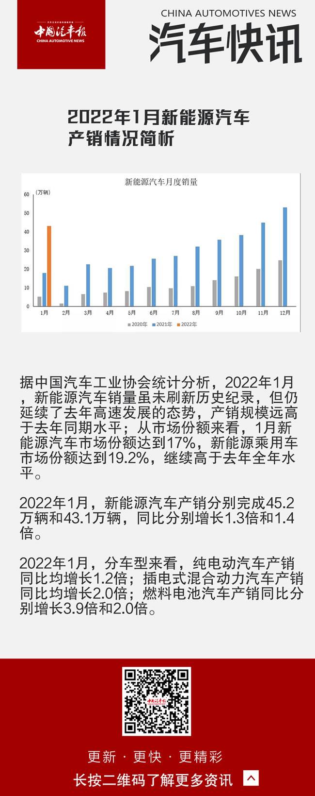 2022年1月,新能源汽车产销分别完成45.2万辆和43.1万辆,同比分别增长1.3倍和1.4倍。