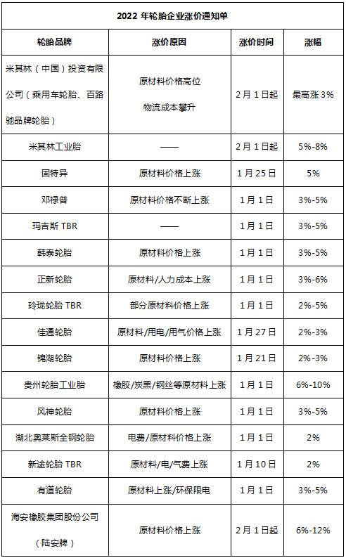 2020年我们期待2021年,2021年我们期待2022年,可曾想2022年开年第一弹是延续了去年的上涨趋势,根据网络上查看的资料显示,2月1日,正是大年初一,多家企业在这一天对轮胎价格进行上调,如下表:
