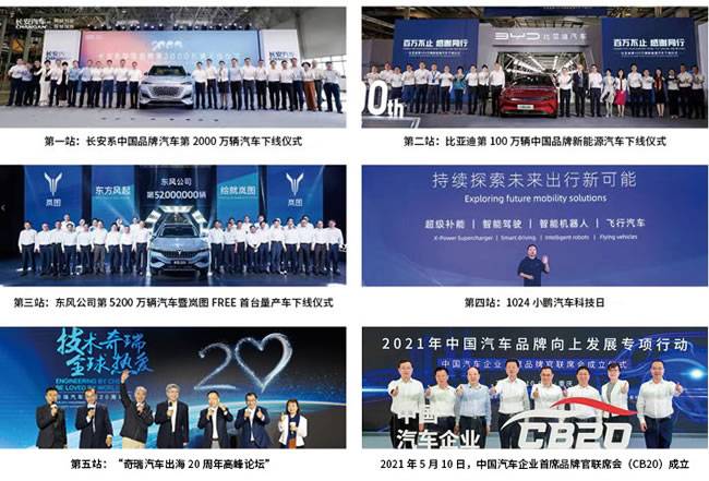作为2021年专项行动的重要组成部分,“看见中国汽车”品牌巡礼全国行活动共举办了5站,即“长安系中国品牌汽车第2000万辆汽车下线仪式”、“比亚迪第100万辆中国品牌新能源汽车下线仪式”、“东风公司第5200万辆汽车暨岚图FREE首台量产车下线仪式”、“1024小鹏汽车科技日”以及“奇瑞汽车出海20周年高峰论坛”活动,分别让各界看到了中国品牌汽车在自主发展、电动化、品牌高端化、智能化、出海等方面取得的重大突破和优异成绩,充分彰显了中国汽车品牌的实力与自信,赢得各界热烈反响和充分肯定。