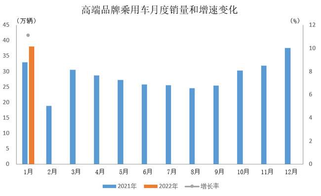 2022年1月,国内生产的高端品牌乘用车销量完成38.1万辆,同比增长11.1%,高于乘用车总体增速4.4个百分点。
