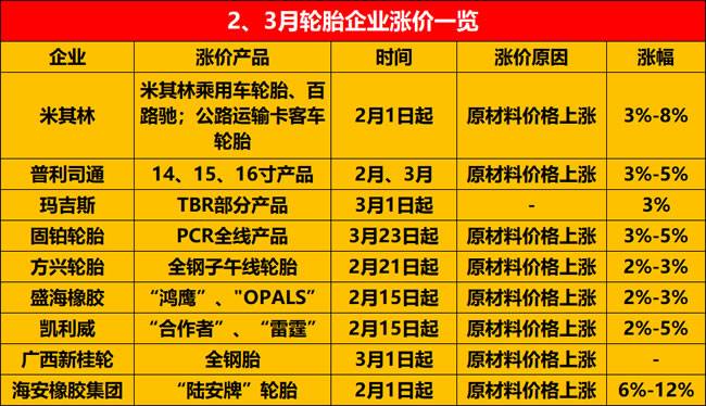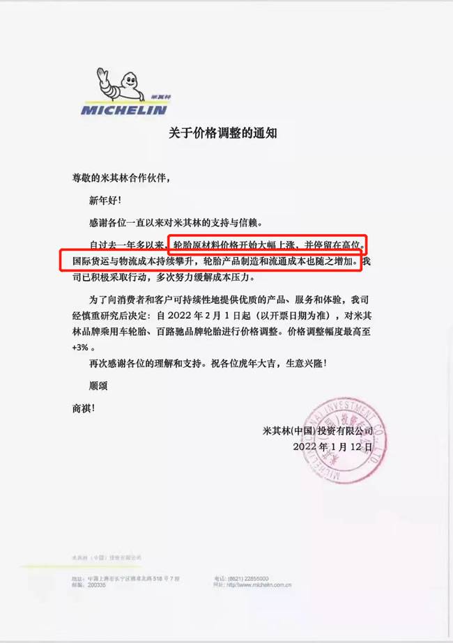 轮胎涨价原因各企业的涨价通知单都已明确显示,比如米其林2022年后发布的通知单称: