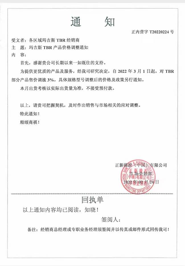 2月24日,玛吉斯发布涨价通知称,自3月1日起,对TBR部分产品售价调涨3%: