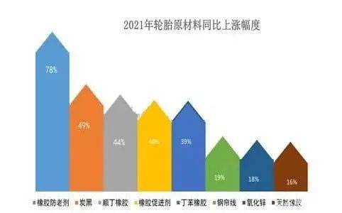 有数据显示,2021年轮胎用橡胶防老剂均价同比上涨78%,炭黑均价同比上涨49%,丁苯橡胶、顺丁橡胶、丁苯橡胶的同比上涨超过40%。