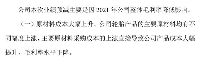 在玲珑轮胎公布的《山东玲珑轮胎股份有限公司 2021 年年度业绩预减公告》中就表示,公司这次业绩预减主要是因为2021年公司整体毛利率降低影响,毛利率低最大的原因就是原材料成本大幅上升。