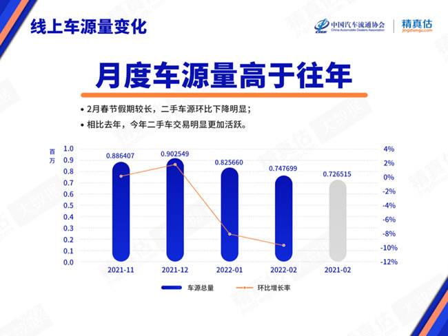 精真估数据研究员李明表示,2月份不仅有春节假期,而且还比其他月份少了两个工作日,所以二手车车源量环比下降很正常。另外,由于买卖双方都已经适应了“原地过年”,因此交易热情比往年更高,长假期间经济活动并不停滞。